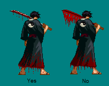 Blood on Clothing Blood on clothing is the most difficult part to master. You must be able to add the blood and still make it look like your character is wearing clothes and not a painted tarp. In any case, first decide where you want the blood. Do you want it splattered up their clothes, dripping from them, or do you just want them covered in it? The easiest of course is splattered up their clothes, so we'll do that. Decide what shades you want to use. Look at the clothes, if they're light, use the light shades, if they're dark, use the dark shades. And try to not use too many different colors. The more simple, the better it will look. Start with the darkest color and work to the lightest, it's best to keep your blood down to 4 or 5 colors. Draw the blood from bottom to top, certain areas will be lighter than others, and some spots will just have little splatters. If you want to coat your character in blood, the best thing to do is pick out blood shades that you can use to replace the clothing colors with. Here is the example, a skin I made a while back for Vampyro. The shoes are soaked in blood, but you can still see the detail in them. (You can coat the blood on differently, but I thought this looked the best.) The blood splatters unevening up his legs and depending on the color of the material underneith the blood, the red changes shades. It also splatters slightly after the line, giving a natural uneven look.